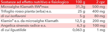 Microalghe Klamath RW® max (Aphanizomenon flos aquae), Coenzima Q10 (ubidecarenone), Lino (Linum usitatissimum L.) semi, agente di carica: Cellulosa microcristallina; amido di Mais pregelatinizzato, amido di Mais, Bamboo (Bambusa spp.) germogli e.s. (75% Silicio), Patata polvere (Creamy).